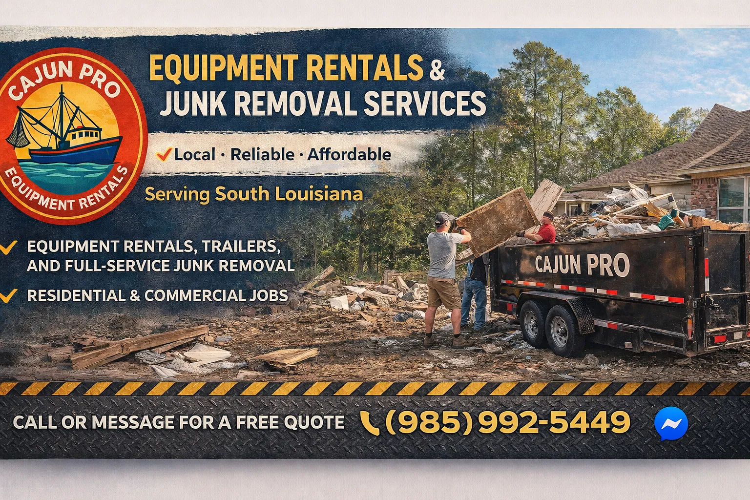 Cajun Pro Equipment Rentals is a locally owned and operated business proudly serving South Louisiana. We specialize in providing reliable equipment rentals and hands-on services designed to make tough jobs easier for homeowners, contractors, and businesses alike.